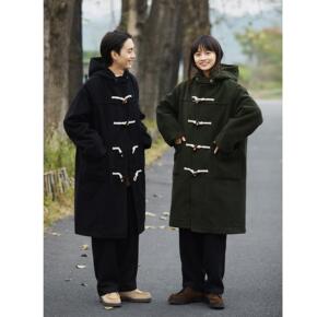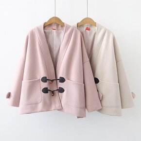 韩国chic秋冬温柔气质翻领牛角扣宽松双口袋长袖中...