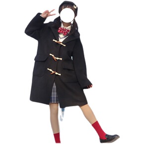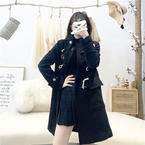 布丁丁熊原创jk牛角扣大衣毛呢外套女冬季呢子制服黑...