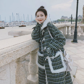 欧韩小香风现代双面中长款牛角扣连衣裙格子粗纺高端大...