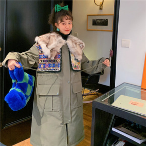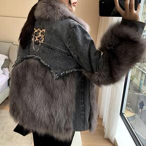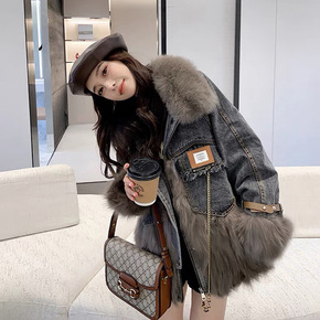 狐狸毛领羽绒皮毛一体牛仔派克服大衣外套2021冬季...