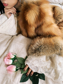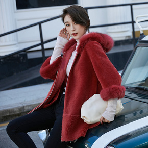 落日芍芍芬兰整皮狐狸毛酒红色皮草外套女中长款显瘦气...