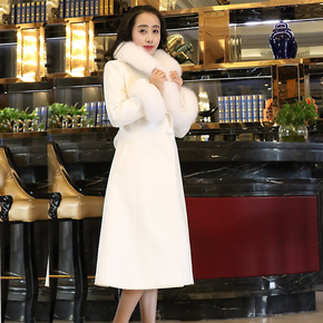 跨境女装2019秋冬新款欧美大牌仿狐狸毛领中长款毛...