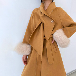 「安斐欧娜」双面羊绒大衣女秋冬高端长款过膝袖口狐狸...