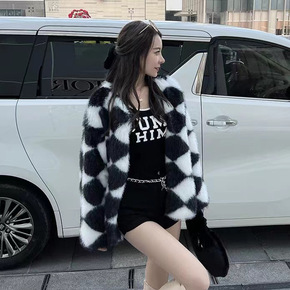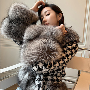 棋盘格毛毛外套女冬季中长款加绒加厚小个子狐狸毛皮草...
