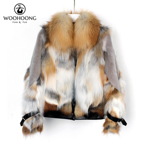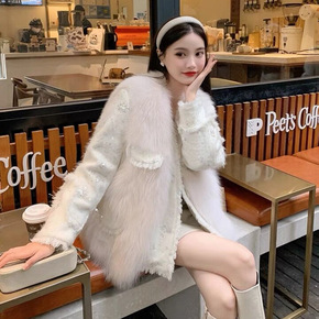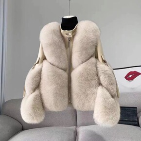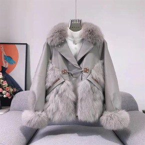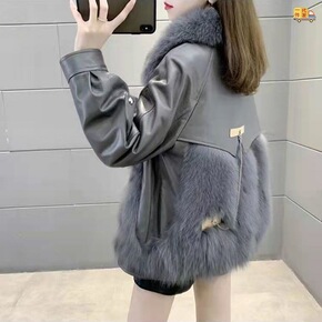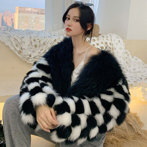 2022年秋冬新款狐狸毛外套女短款方领坎毛皮草拼接...
