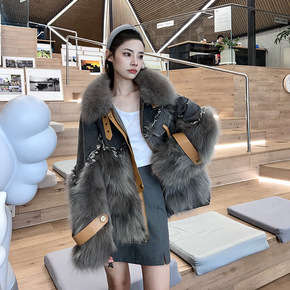 新款牛仔拼整皮仿狐狸毛皮草外套显瘦大衣短款加棉派克...