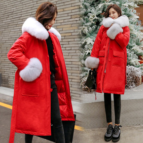 羽绒服女中长款冬新款韩版狐狸毛领火烈鸟刺绣小个子派...