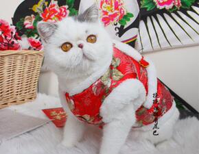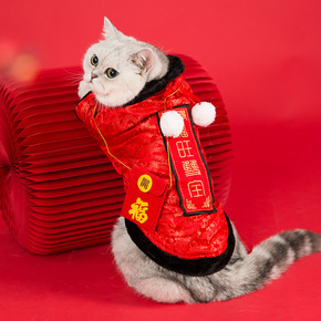 新年礼!猫咪过年衣服保暖无袖加绒冬装喜庆刺绣旗袍中...