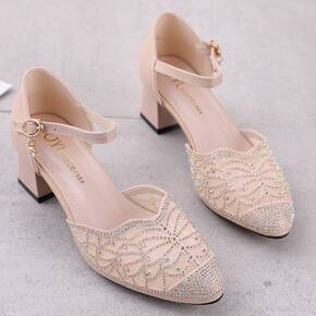 2021春秋新款中跟粗跟猫跟女鞋中空时尚一字带扣尖...