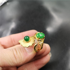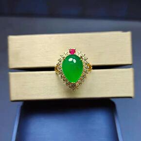 老玉匠 925银镶嵌女款绿玉髓戒指 白底青翠玉戒指...