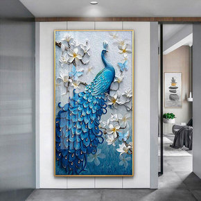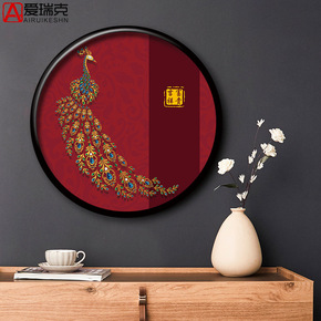 中式招财圆形玄关走廊过道装饰画竖版进门孔雀装饰画入...