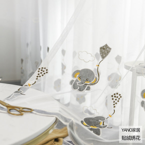 儿童卡通窗帘纱 大象刺绣飘窗绣花短纱帘 卧室阳台成...