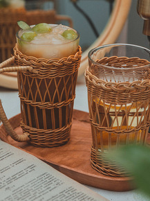 丨网红INS风藤编杯套带把手加厚玻璃水杯咖啡杯套装...