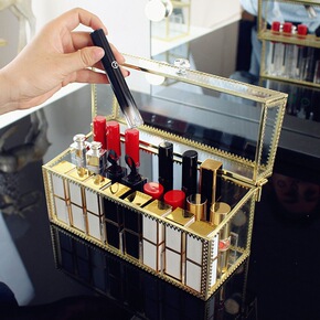 桌面网红带盖黄铜玻璃口红展示架多格化妆品防尘唇釉唇...