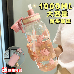 1000ml大容量玻璃水杯子女带吸管刻度高颜值耐热...