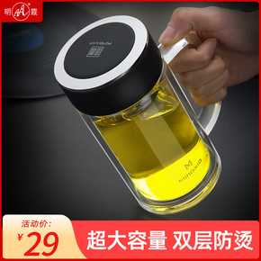明霞双层玻璃杯 带把手过滤茶杯便携办公水杯男女商务...