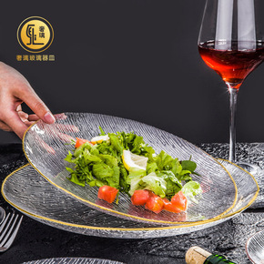 创意ins锤纹金边玻璃托盘子水晶水果盘家用玻璃餐盘...