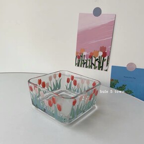 ins风郁金香玻璃碗方形碗水果沙拉碗点心零食碗花朵...