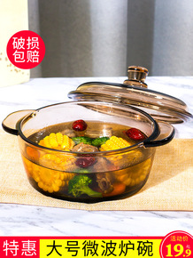 透明耐热玻璃碗双耳煲带盖大容量泡面碗饭碗微波炉烤箱...