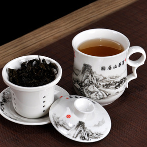 青花瓷茶杯陶瓷过滤带盖内胆茶水分离会议办公室大水杯...