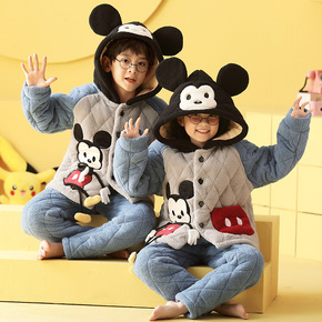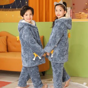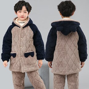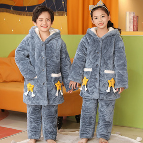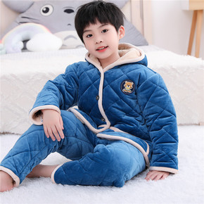 儿童珊瑚绒睡衣冬季男孩三层夹棉加厚款套装男童女童法...
