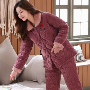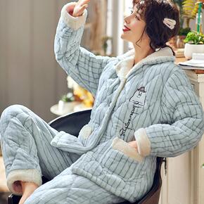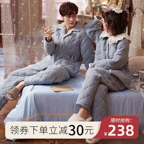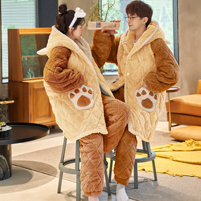 情侣睡衣男女士加厚珊瑚绒三层夹棉大码外穿保暖棉袄家...