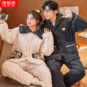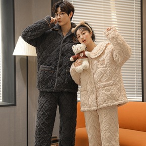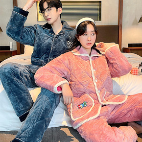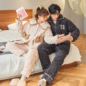 秋冬季珊瑚绒情侣睡衣女士三层夹棉加厚加绒男款法兰绒...