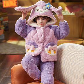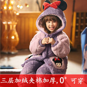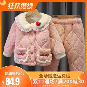 儿童睡衣法兰绒秋冬三层夹棉加厚珊瑚绒冬季女童加绒家...