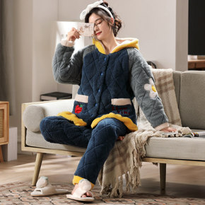 情侣睡衣女秋冬季珊瑚绒三层夹棉套装冬天加绒加厚家居...