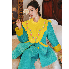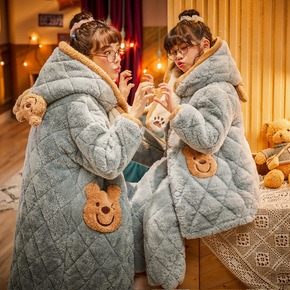情侣睡衣女秋冬珊瑚绒三层夹棉加厚加绒保暖提花长毛绒...