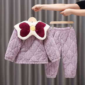 儿童法兰绒睡衣冬季三层夹棉加厚家居服套装小孩子女童...
