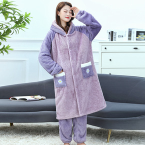 纯色冬季中长款加厚珊瑚绒夹棉连帽睡衣中年妈妈月子服...