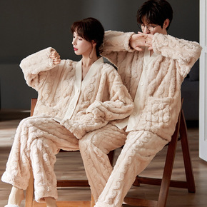 拼色款 法兰绒睡袍睡衣女秋冬 情侣睡衣 家居服 珊...