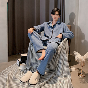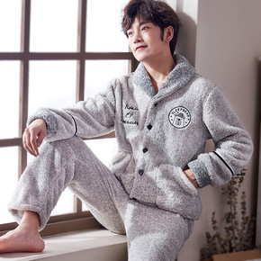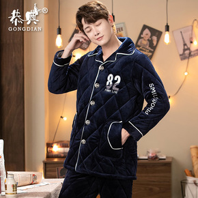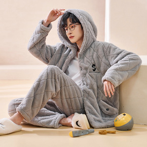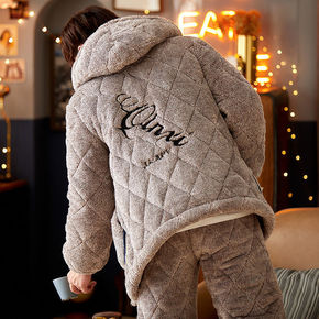 冬季男士睡衣三层加厚加绒珊瑚绒法兰绒保暖夹棉袄青年...
