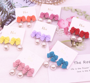 儿童新款蝴蝶结仿珍珠吊坠耳环女童宝宝无耳洞耳夹耳钉...