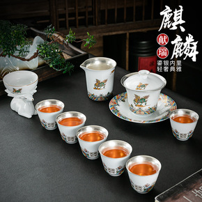 999纯银茶具套装家用麒麟献瑞珐琅彩银陶瓷茶壶茶杯...