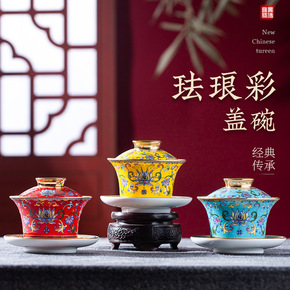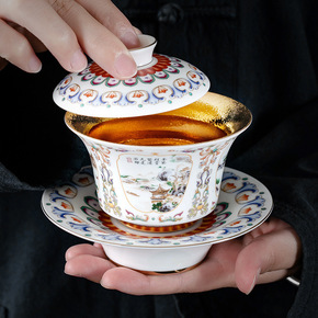 珐琅彩三才盖碗茶杯陶瓷手工鎏金陶瓷泡茶碗功夫茶具敬...