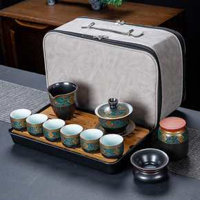 千代 旅行茶具户外便携包套装 珐琅彩一壶四杯干泡盘...