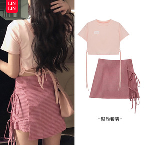 鬼马少女甜美粉色性感修身短袖套装 高腰绑带格子半身...