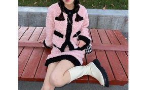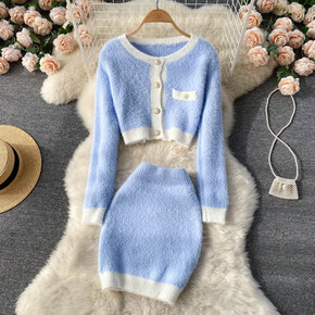 小香风针织套装女春秋新款温柔甜美撞色短款开衫毛衣半...