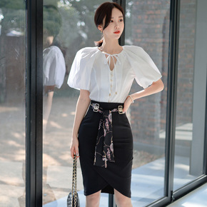 新款两件套2022夏韩版修身泡泡袖上衣收腰时尚包臀...