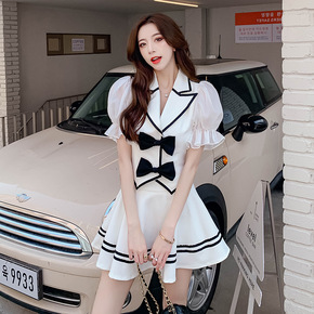 套装女2022春夏甜美时尚西装领蝴蝶结泡泡袖上衣半...