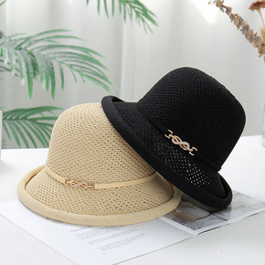 新款纱线针织帽子女韩版简约金属扣盆帽圆顶透气遮阳帽...