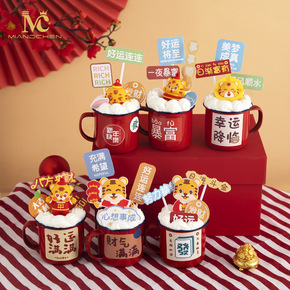新年杯创意蛋糕装饰 红漆小杯招财进宝新年老虎蛋糕装...