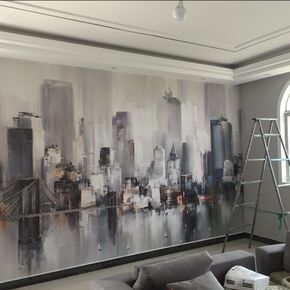 北欧手绘抽象城市油画艺术壁纸客厅电视背景墙纸个性纽...