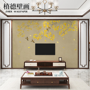 现代轻奢墙布电视背景墙卧室客厅沙发墙纸金色银杏叶高...