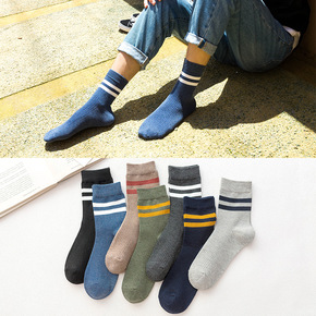 秋冬新品中筒抽条休闲男袜 袜子男士棉质2杠条纹透气...