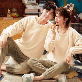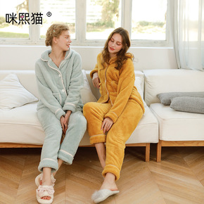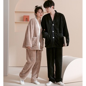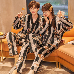 冬款情侣睡衣女开衫V领和服法兰绒加绒加厚保暖男士家...