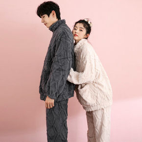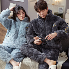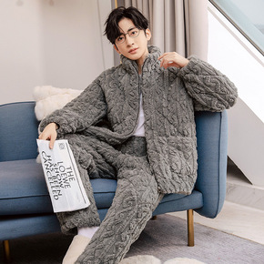 棉睡衣男士冬季加厚加绒三层夹棉超厚珊瑚绒拉链冬天法...