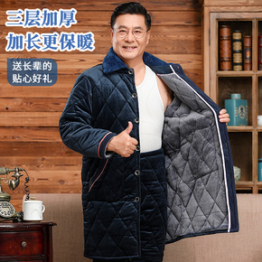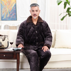 男士睡衣冬季加长珊瑚绒三层夹棉中老年人加厚加绒爸爸...